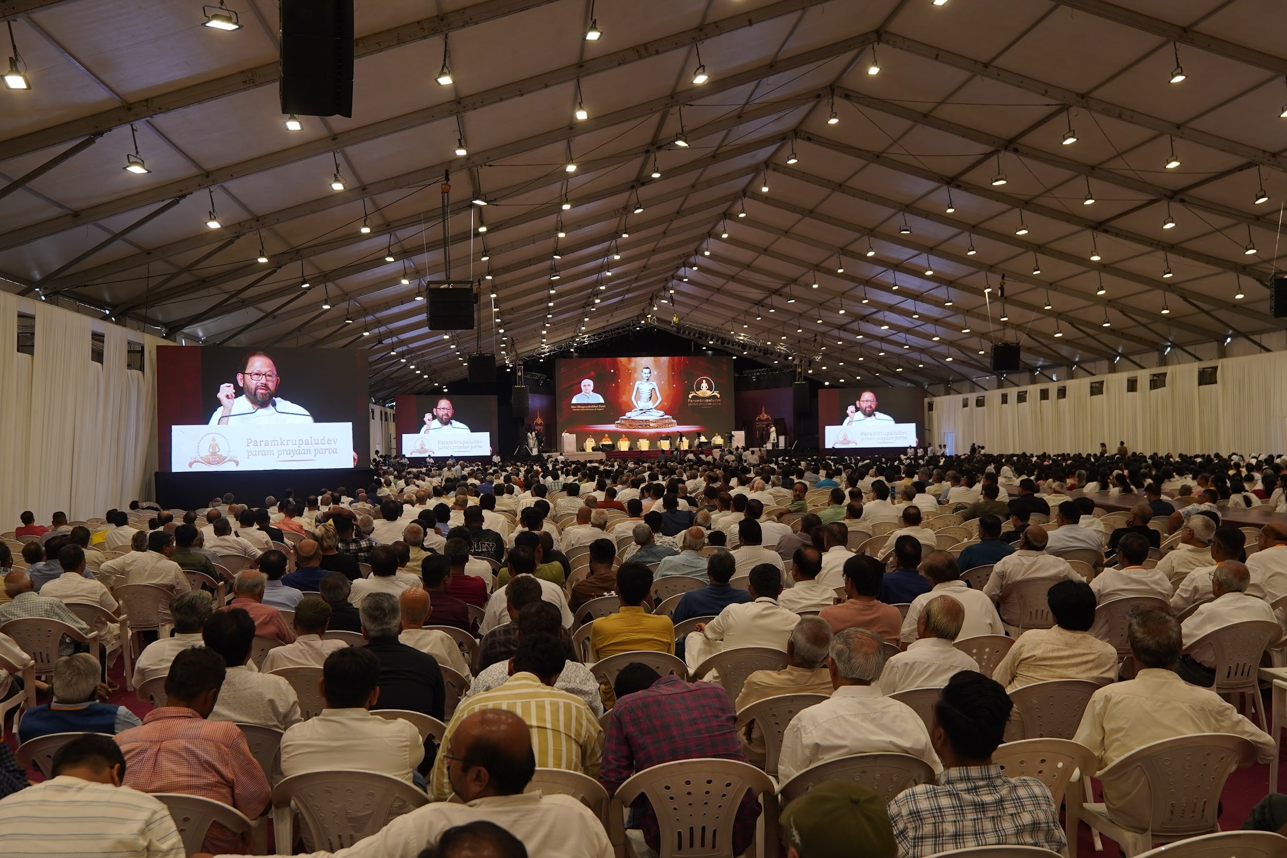 The event is being attended by a revered assembly of saints and spiritual luminaries, including Pujya Gurudevshri Rakeshji (Shrimad Rajchandra Mission Dharampur), Pujyashri Nalinbhai (Shree Raj Saubhag Satsang Mandal, Sayla), Pujya Ben Shri Ratna Prabhu (Shrimad Rajchandra Mission Delhi) and Adarniya Shri Sureshji (Shrimad Rajchandra Adhyatmik Sadhana Kendra, Koba), along with representatives from various ashrams and organisations dedicated to the teachings of Shrimad Rajchandraji.